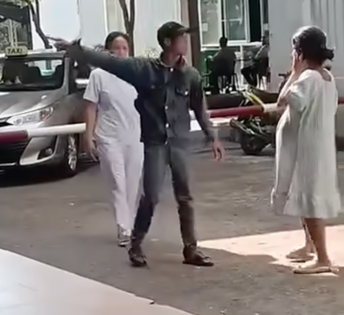 Sau khi khám xong, chị L. và một người đàn ông có nói chuyện với nhau ở khu vực sân bệnh viện. Bất ngờ, người đàn ông tát mạnh vào mặt sản phụ P.T.K.L.. Cú tát khiến sản phụ P.T.K.L. choáng váng muốn ngã.