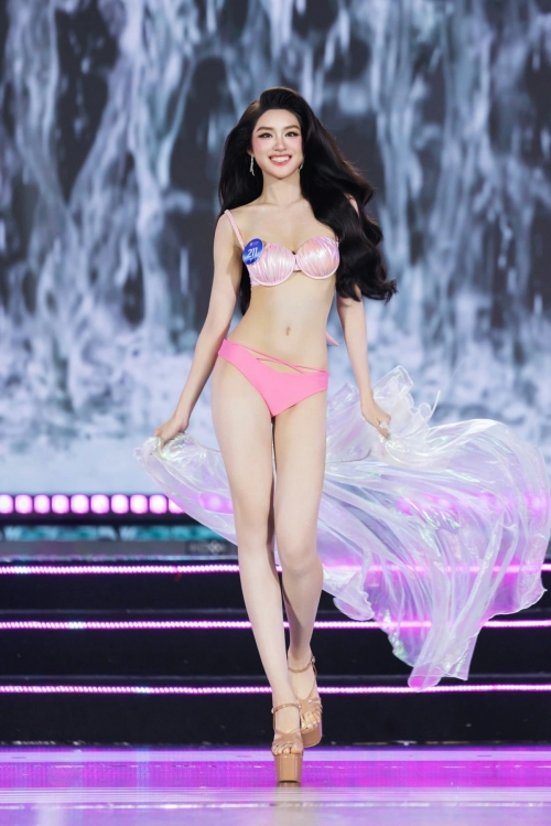 Một điểm đặc biệt của chương trình là phần đồng diễn áo tắm với tông màu xanh và hồng pastel. Thay vì catwalk theo nhóm như các cuộc thi khác, các thí sinh đã thực hiện màn nhảy đồng diễn năng động. Tiếp đó, Hoa hậu Quế Anh đã mở màn tiết mục trình diễn trang phục dạ hội với ca khúc "The Only You", tạo không gian cho Top 10 khoe vẻ đẹp yêu kiều, sang trọng.