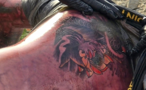 Trên lưng nạn nhân xăm hình cá chép bên hoa sen. |