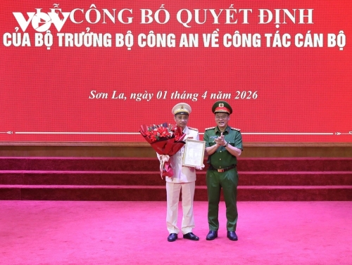 Bí thư Tỉnh ủy Sơn La Hoàng Văn Nghiệm trao quyết định của Ban Thường vụ Tỉnh ủy về việc chỉ định Đại tá Nguyễn Minh Tuấn, Giám đốc Công an tỉnh tham gia Ủy viên BCH Đảng bộ, Ủy viên BTV Đảng ủy, giữ chức Bí thư Đảng ủy Công an tỉnh, nhiệm kỳ 2026-2031. |