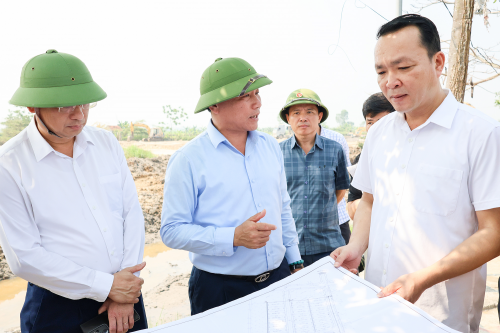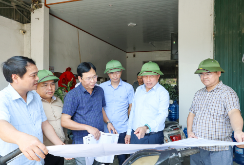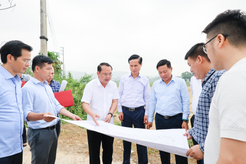 Phó Chủ tịch UBND tỉnh Hoàng Phú Hiền cùng các thành viên đoàn công tác kiểm tra hiện trường, nghe báo cáo tiến độ thực hiện khu tái định cư trên địa bàn xã Thần Lĩnh |