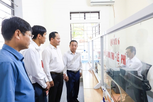 Phó Chủ tịch UBND tỉnh Nguyễn Văn Đệ và các thành viên đoàn công tác kiểm tra việc vận hành và chất lượng phục vụ người dân tại Trung tâm phục vụ hành chính công xã Thiên Nhẫn