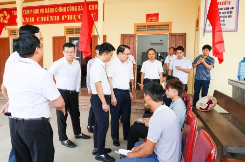 Phó Chủ tịch UBND tỉnh Phùng Thành Vinh và các thành viên đoàn công tác kiểm tra thực tế tại Trung tâm phục vụ Hành chính công xã Thuần Trung và trao đổi với người dân |