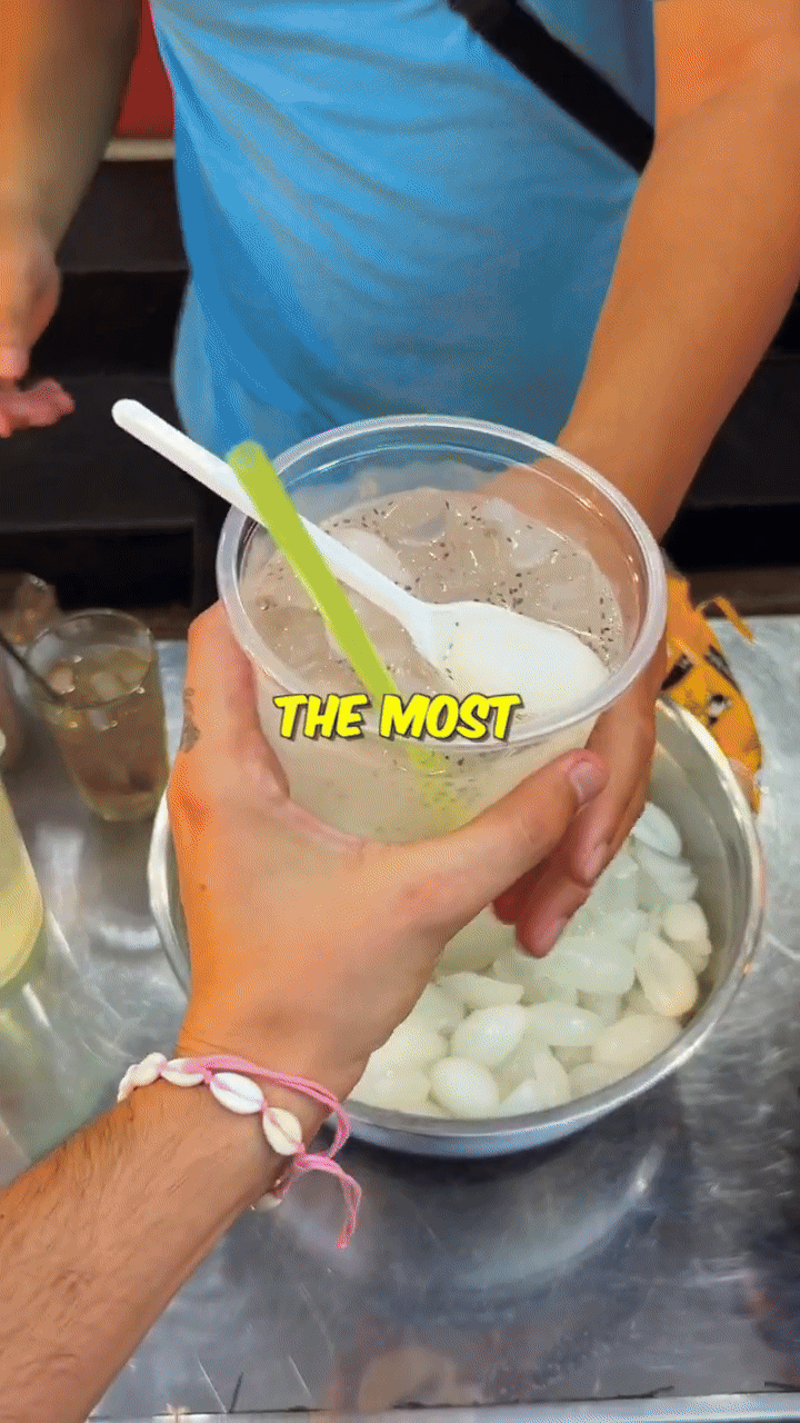 Trong đoạn clip, vị khách Tây đang được thưởng thức một cốc cơm dừa nước dầm đường, đá, thêm một chút hạt chia. Đây là một món giải khát đơn giản nhưng lại vô cùng thơm ngon với vị mát ngọt tự nhiên lại dai dai giòn giòn như thạch của lớp cơm dừa nước, sẽ khiến bạn thưởng thức một lần là không thể nào quên.