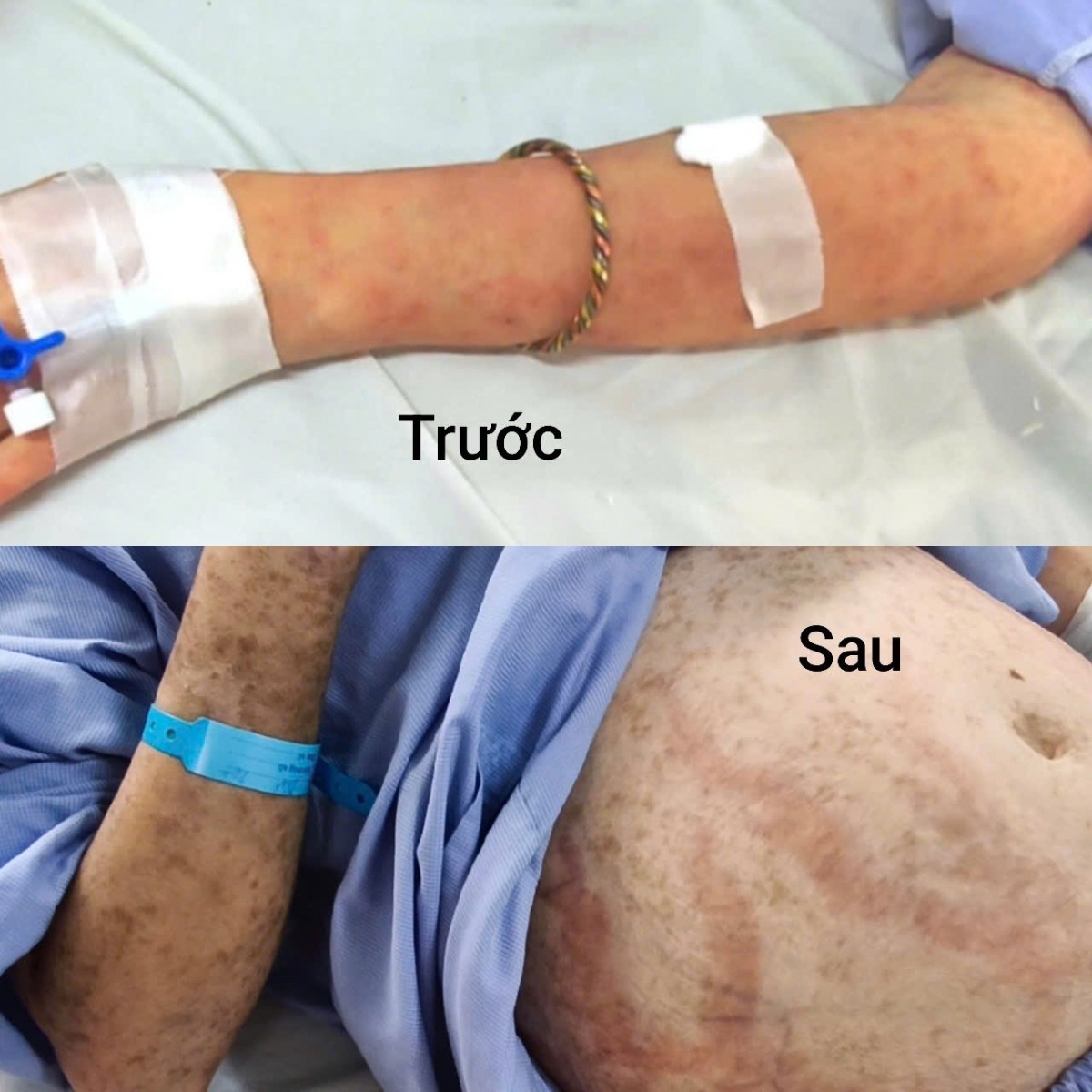 Sau một ngày dùng thuốc, bệnh nhân bắt đầu nổi ban đỏ, ngứa, sưng phù toàn thân và được đưa đến cở y tế với chẩn đoán dị ứng thuốc. Dù được điều trị trong 7 ngày, tình trạng không cải thiện mà còn nặng thêm, chị được chuyển đến Bệnh viện Bệnh Nhiệt đới Trung ương. Tại đây, bệnh nhân được điều trị tại Khoa Nội tổng hợp.
