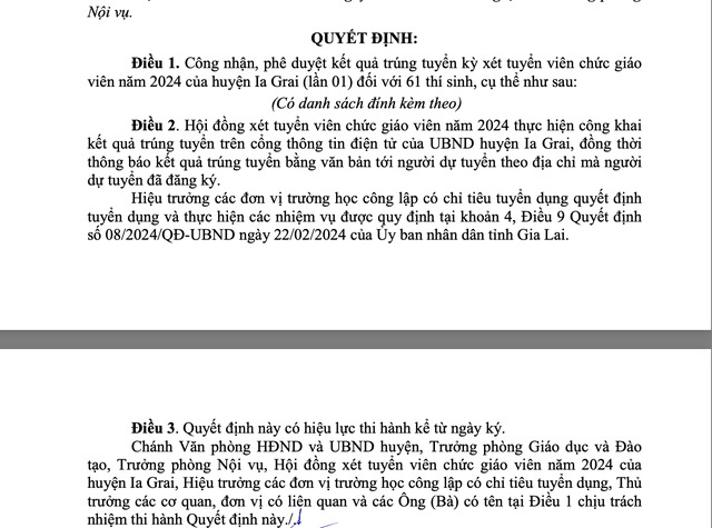 Vào ngày 24-3, UBND huyện Ia Grai ban hành Quyết định số 307/QĐ-UBND về việc công nhận, phê duyệt kết quả trúng tuyển kỳ xét tuyển viên chức giáo viên năm 2024 (lần 1).