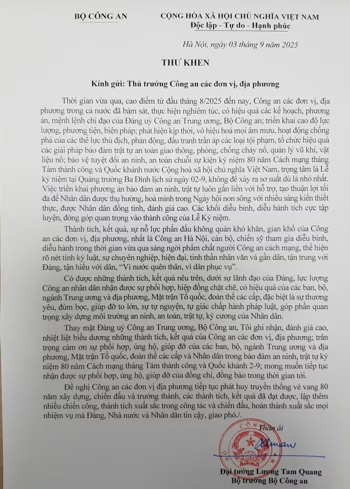 Ngày 3/9, Đại tướng Lương Tam Quang - Bộ trưởng Bộ Công an có Thư khen gửi Thủ trưởng Công an các đơn vị, địa phương.
