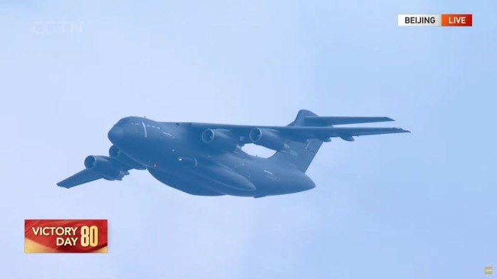 Máy bay vận tải quân sự Y-20A và phiên bản nâng cấp Y-20B, tài sản chủ chốt trong năng lực vận tải hàng không chiến lược của Quân Giải phóng Nhân dân Trung Quốc (PLA), cũng được nhìn thấy trong một đội hình chung.