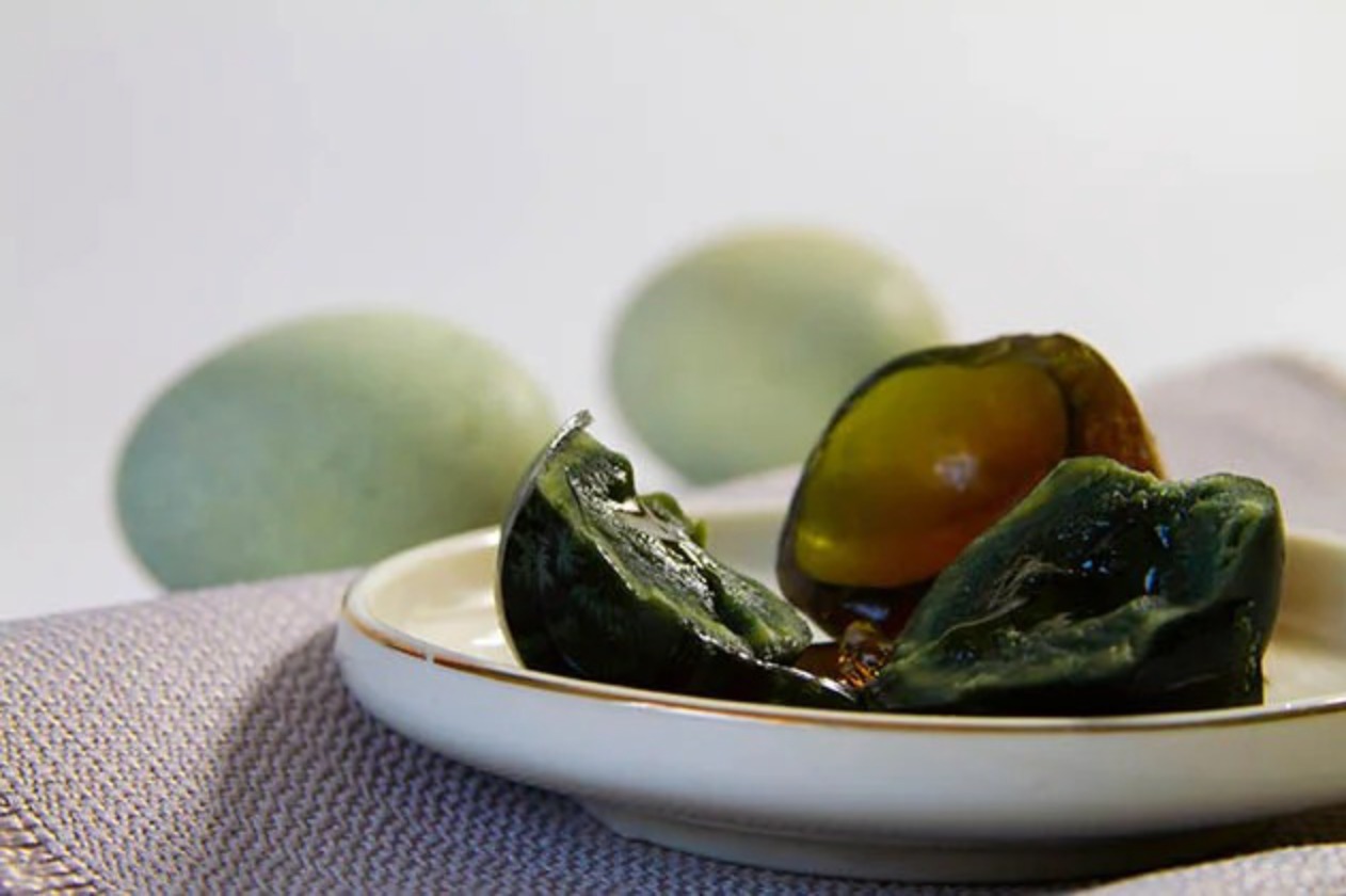 Century Egg - món "trứng ngàn năm" trứ danh, được ủ trong hỗn hợp đất sét, tro, muối, vôi và trấu. Thành phẩm có lớp vỏ lốm đốm, lòng trắng màu nâu đen trong suốt như thạch, lòng đỏ xanh xám với mùi hăng, vị béo và hơi khai. Đây là món ăn gây tranh cãi: người thích thì khen độc đáo, người sợ thì chỉ ngửi đã muốn bỏ chạy.