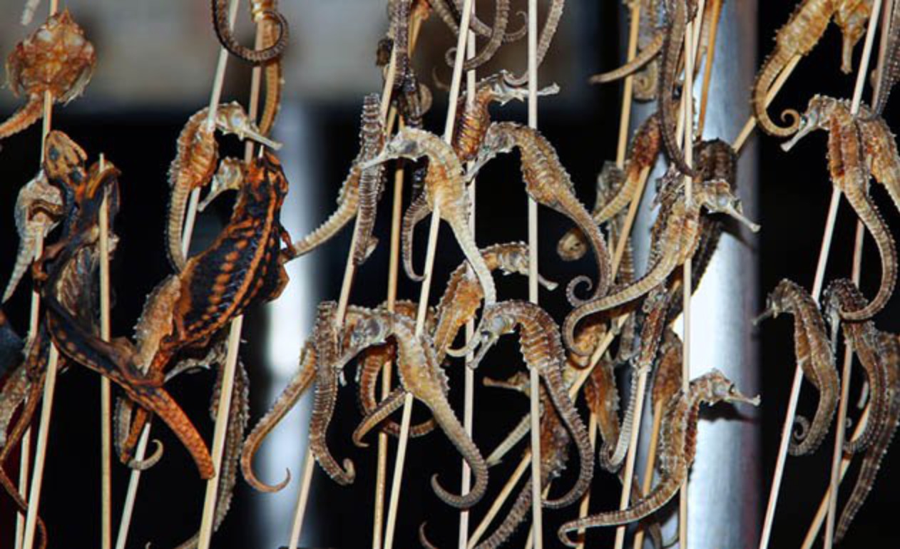 Những con cá ngựa - vốn quen thuộc dưới đại dương - được xiên que, tẩm gia vị rồi chiên giòn. Vị được miêu tả khá giống mực, mằn mặn, nhưng giá lại không hề rẻ. Dù vậy, nhiều thực khách vẫn sẵn sàng chi tiền vì tin món này tốt cho sức khỏe.