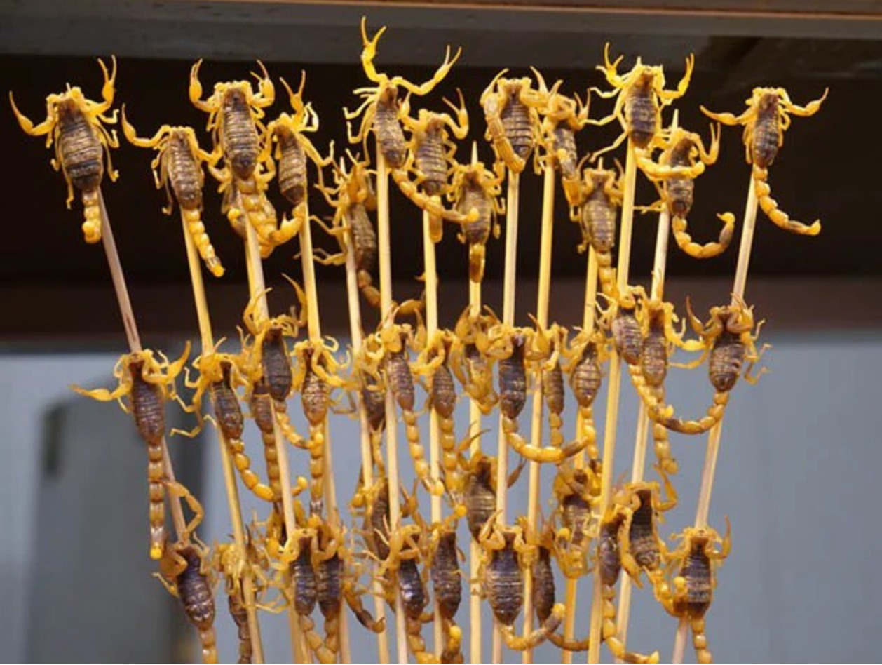 Những con bọ cạp sau khi chiên giòn trở thành món ăn giòn tan, có vị như bắp rang bơ. Nhiều nơi còn thêm gia vị cay để tăng hương vị. Người dân tin rằng món này giúp nâng cao sức đề kháng, nhưng với du khách, chỉ nhìn thôi đã đủ sởn gai ốc.