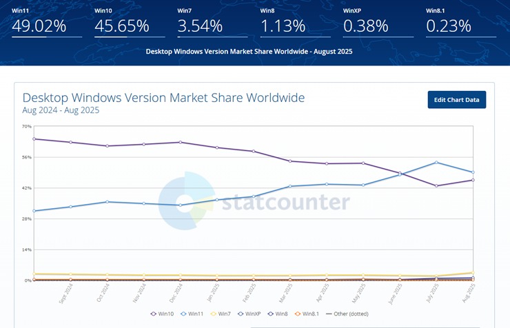 Theo số liệu cập nhật tháng 8/2025 từ StatCounter, nỗ lực biến Windows 11 thành nền tảng chủ lực của Microsoft đang vấp phải một rào cản lớn. Thị phần của hệ điều hành này đã sụt giảm xuống còn 49,08%, sau khi từng đạt đỉnh 53,51% vào đầu năm. Đáng lẽ phải dứt khoát vượt qua cột mốc 50% thì Windows 11 lại đang thụt lùi.