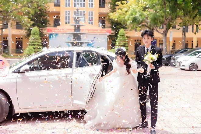 Khi quyết định kết hôn sau 4 năm hẹn hò, cặp đôi chụp ảnh cưới trong khuôn viên trường và dựng rạp cưới ngay tại cổng trường. Đặc biệt, các thầy cô giáo, bác bảo vệ cũng được mời đến dự, biến nơi đây thành "hôn trường" đầy kỷ niệm.
