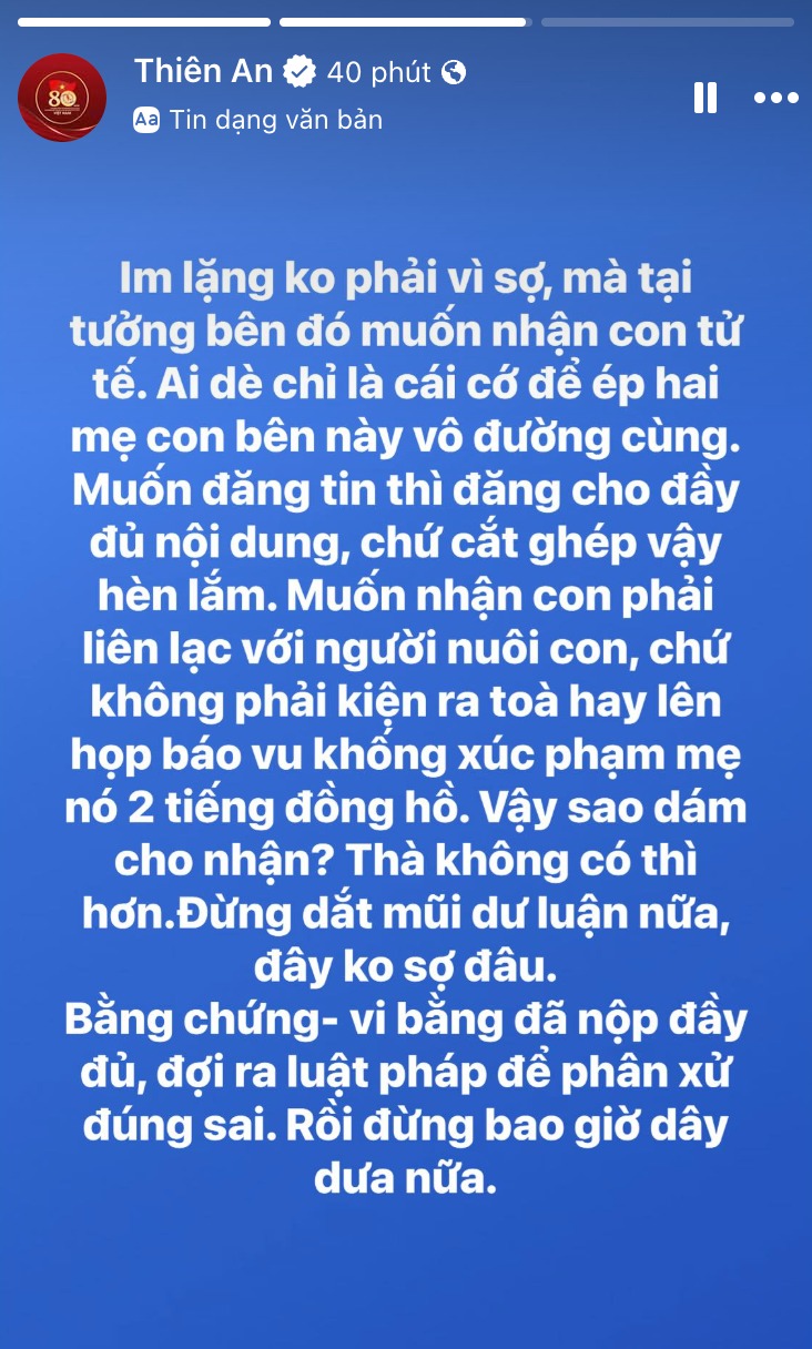 Bên cạnh đó, nữ diễn viên còn viết hẳn một đoạn trạng thái dài, lần đầu phản pháo trực diện về một buổi họp báo kéo dài 2 tiếng đồng hồ. Thiên An khẳng định sự im lặng bấy lâu của mình không phải vì sợ hãi mà vì tin tưởng phía bên kia thật sự muốn nhận con một cách tử tế. Nhưng điều cô nhận lại, theo lời chia sẻ, chỉ là những động thái ép buộc mẹ con cô vào đường cùng.