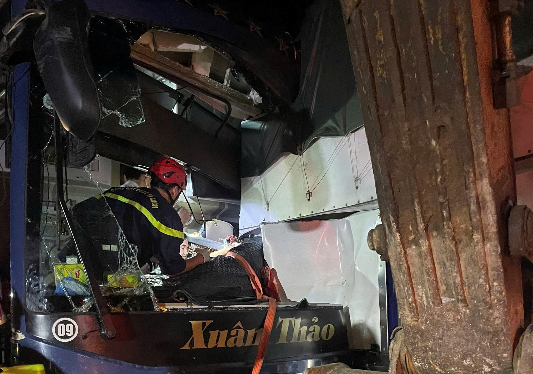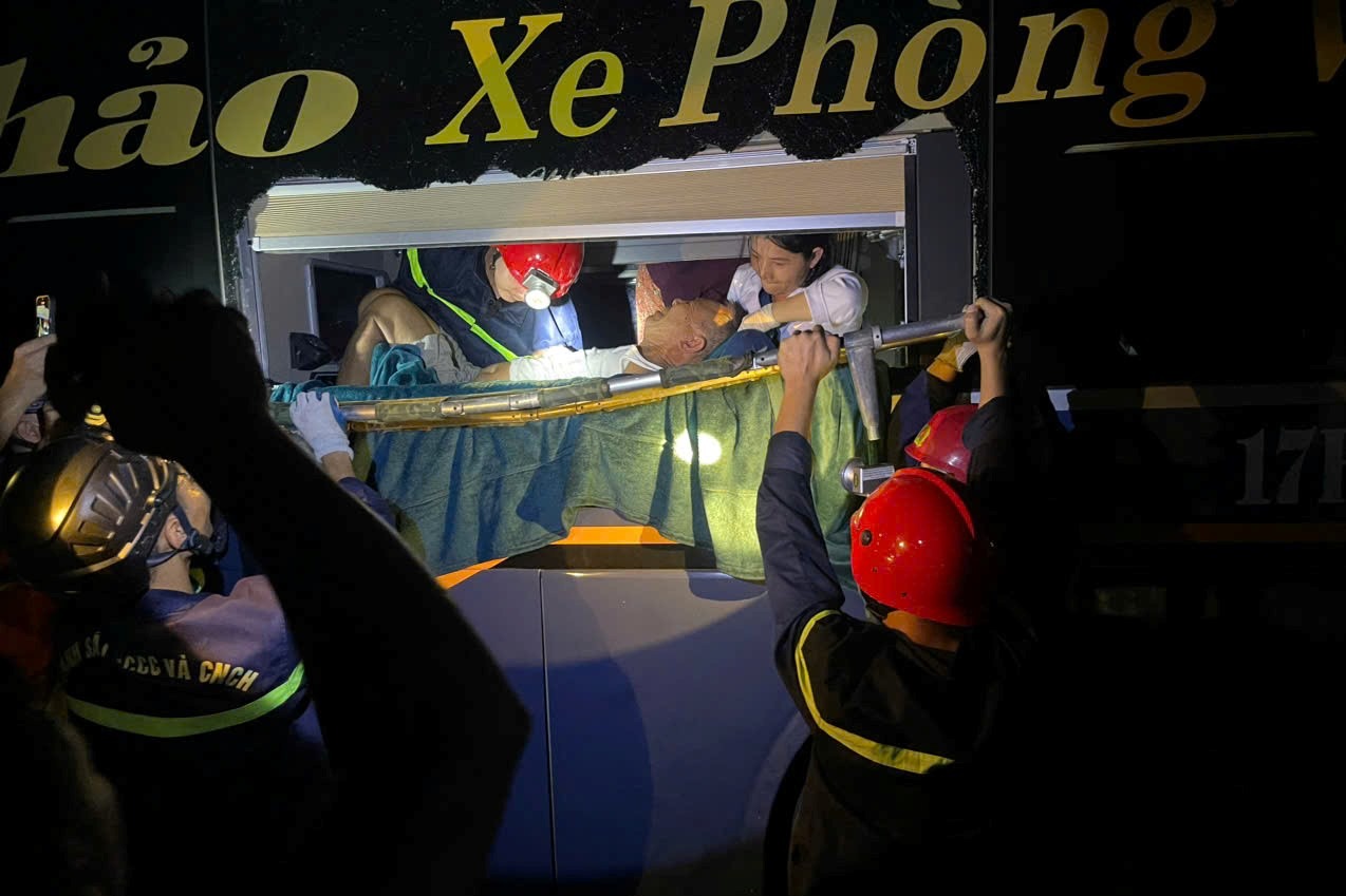 Riêng tài xế xe khách bị kẹt cứng trong cabin đã bẹp dúm, hai chân bị vô lăng và các mảnh vỡ ép chặt.
