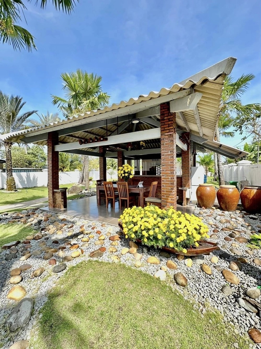 Tại nhà chòi, Lâm Hùng lát sỏi và bày các chum sành tạo cảnh quan đẹp mắt. Ảnh: Ngoisao |