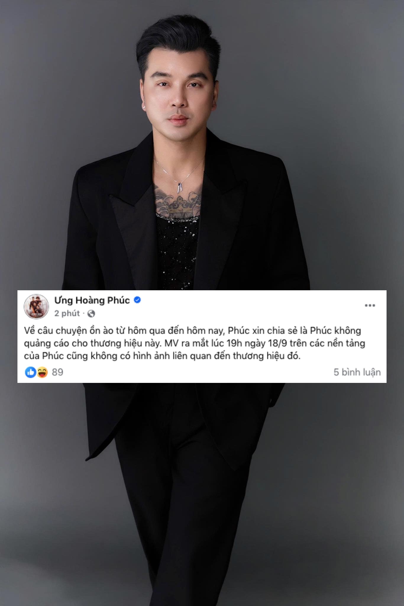 "Về câu chuyện ồn ào từ hôm qua đến hôm nay, Phúc xin chia sẻ là Phúc không quảng cáo cho thương hiệu này. MV ra mắt lúc 19h ngày 18/9 trên các nền tảng của Phúc cũng không có hình ảnh liên quan đến thương hiệu đó", Ưng Hoàng Phúc viết.
