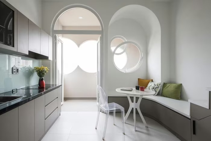 Không gian chung gồm phòng khách nhỏ xinh, bếp hiện đại. Ảnh: Sonmeo Nguyen Art Studio |