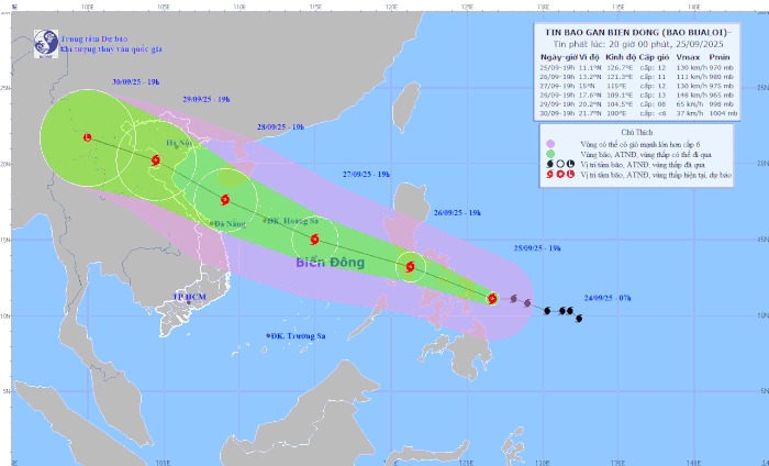 Dự báo, đến 19 giờ ngày 26/9, vị trí tâm bão ở vào khoảng 13,2 độ Vĩ Bắc; 121,3 độ Kinh Đông với sức gió mạnh cấp 11, giật cấp 14; di chuyển theo hướng Tây Tây Bắc với tốc độ khoảng 25 km/giờ và suy yếu dần. Khu vực chịu ảnh hưởng là phía Đông khu vực Bắc và giữa Biển Đông. Cấp độ rủi ro thiên tai cấp 3.