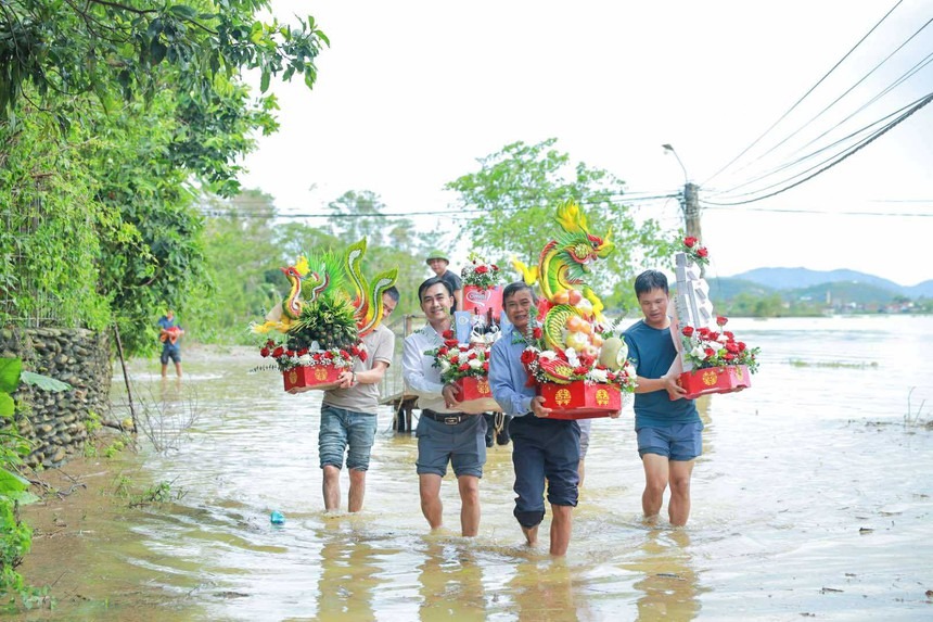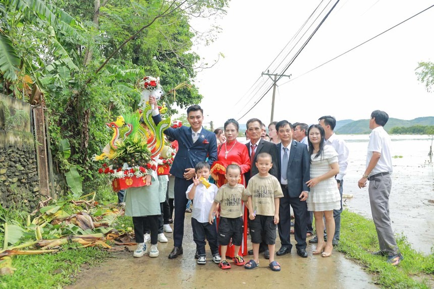 Chú rể Trung Đức chia sẻ: "Ngày vui của chúng tôi trùng vào đúng đợt mưa lũ lớn, gia đình cũng lo lắng nhiều. Nhưng vì đã định ngày, đặt cỗ từ trước, lại được bà con, anh em động viên, nên chúng tôi quyết định vẫn tổ chức. Nhìn cảnh mọi người lội nước, vẫn cười vui đến chúc mừng, thật sự tôi rất xúc động và biết ơn".