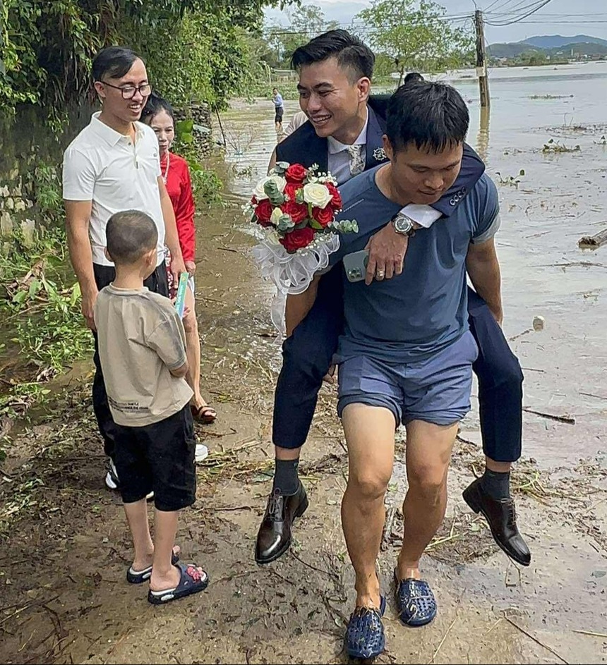 Chú rể được người nhà cõng qua điểm ngập lụt |