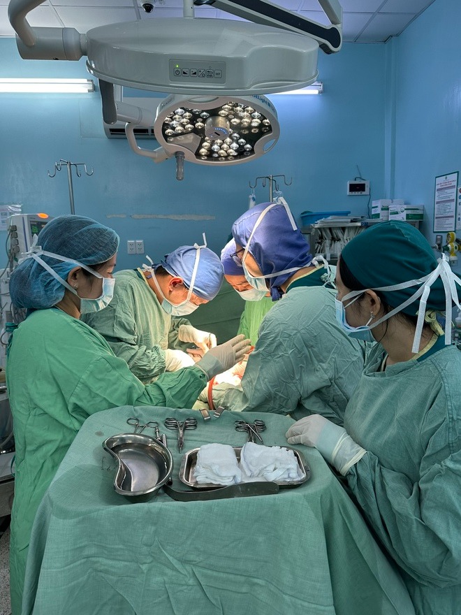 Ê-kíp nội soi xác định dị vật đâm xuyên trực tràng, ruột non và tá tràng viêm dính nhiều, gây khó khăn cho phẫu thuật. Các bác sĩ tiến hành mổ mở bóc tách dọc theo dị vật, tách dính toàn bộ ruột, tránh làm tổn thương các mạch máu thần kinh và niệu quản, hạn chế các tổn thương các bộ phận khác.