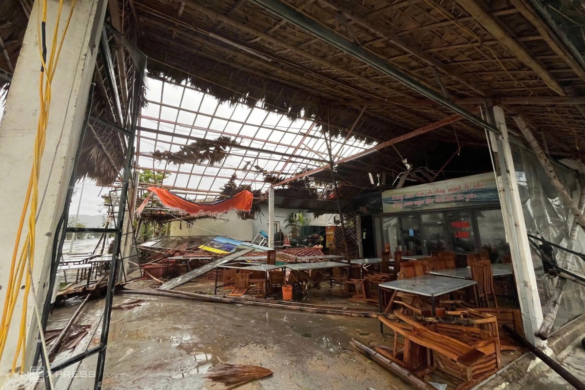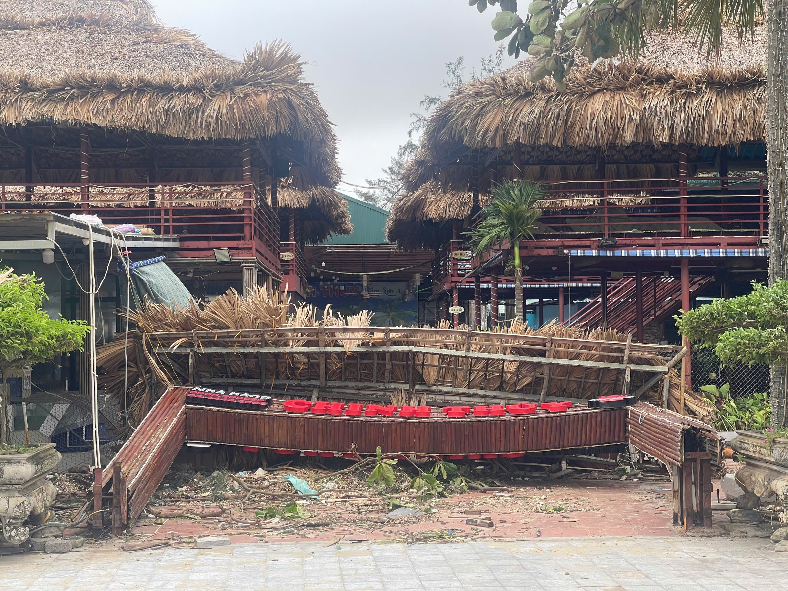 Một nhà hàng ven biển bị tốc mái, gãy khung, dù đã được chủ quán, gia cố, chằng chống trước bão.