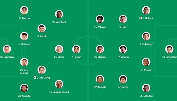 PSG mất 3 ngôi sao tấn công sáng giá nhất (Ousmane Dembele, Desire Doue, Khvicha Kvaratskhelia) nên chấp nhận bị chủ nhà Barcelona lấn lướt trong phần lớn thời gian hiệp một.