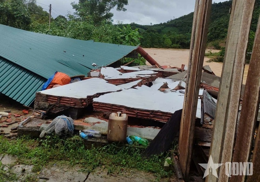 Nhiều ngôi nhà ở xã Nga My bị lũ cuốn đổ sập, hư hỏng nặng. |