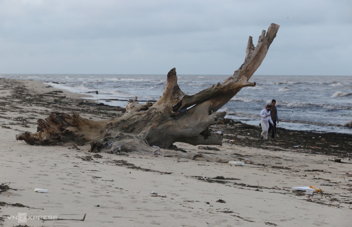 Gốc cây khô khá lớn trôi dạt nằm trên bãi cát, chưa được thu dọn. |