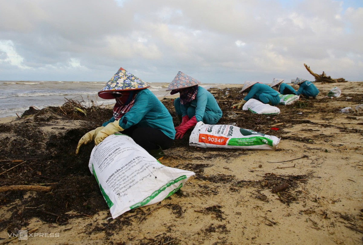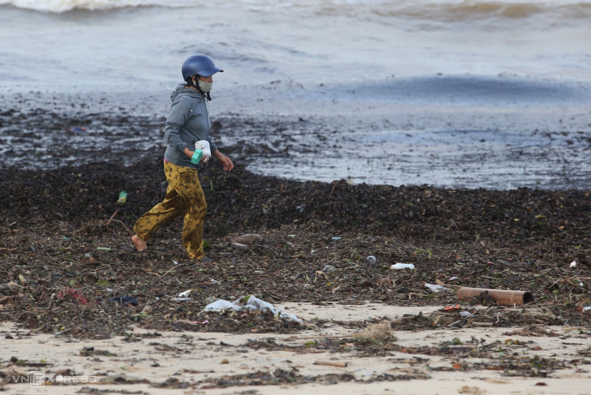 Ông Trần Văn Tân, chủ cơ sở dịch vụ ven biển, cho biết rác tấp dày đặc sau bão. Gia đình ông ba ngày nay dọn từ sáng đến tối mà vẫn không xuể. "Dọn hôm nay xong thì tối rác lại tấp vào, nhưng để bán hàng thì phải dọn sạch", ông giải thích. |