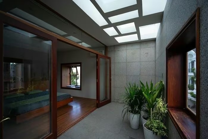 Sân trong được thiết kế cảnh quan và các khối phụ trợ cách nhiệt cho phòng ngủ. Ảnh: Quangdam |