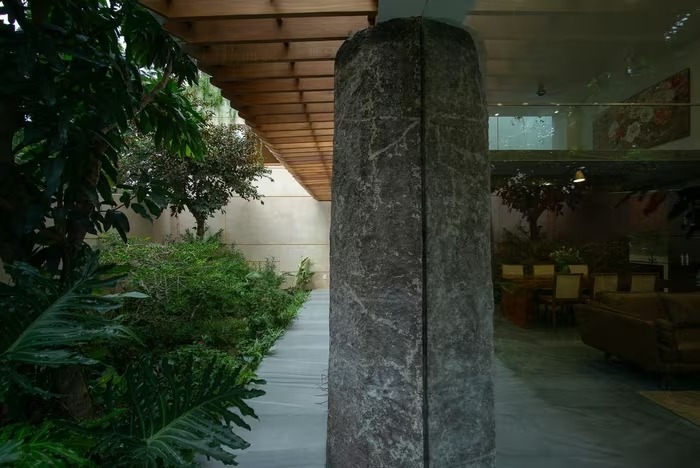 Để giảm bớt sức nóng gay gắt từ hướng Đông và Tây, ngôi nhà được thiết kế như một phiến đá được nâng lên, tạo ra một không gian đệm bên dưới, giống như một mái vòm. Ảnh: Quangdam |