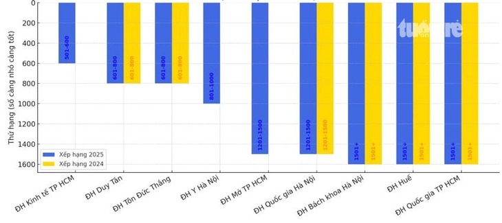 Tuy nhiên, cần lưu ý rằng trong các năm trước, Đại học Duy Tân và Trường đại học Tôn Đức Thắng từng đạt vị trí cao hơn, thuộc nhóm 401-500 trong bảng xếp hạng THE 2023, cho thấy sự thay đổi đáng kể trong kết quả xếp hạng năm 2025.
