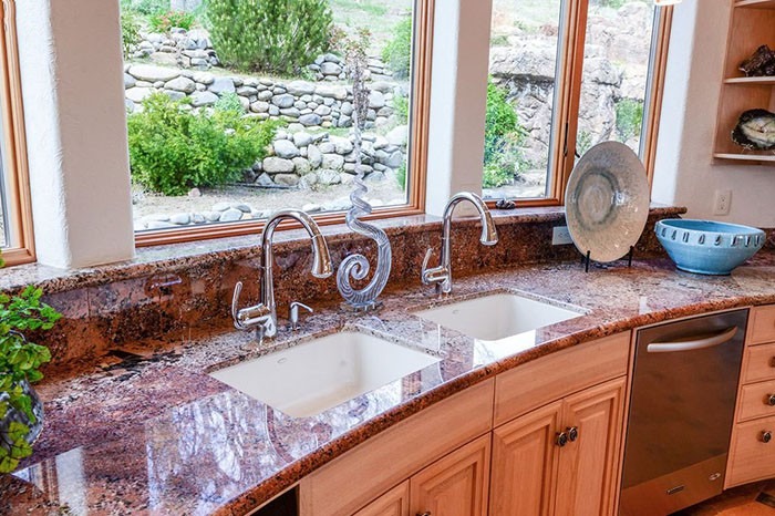 Nhà tắm được lát bằng đá granite Van Gogh xanh. |