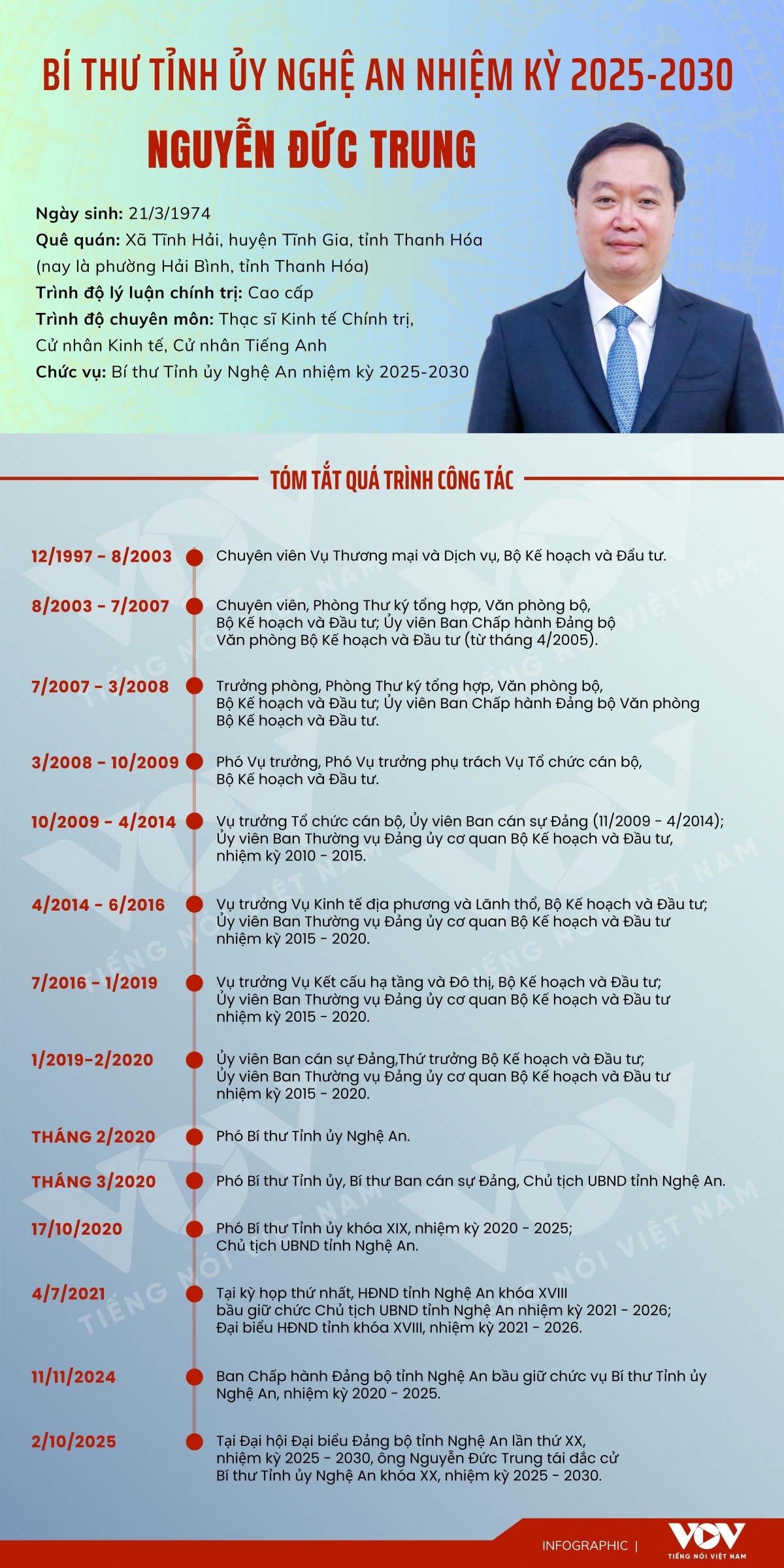 Tại Đại hội Đại biểu Đảng bộ tỉnh Nghệ An lần thứ XX, nhiệm kỳ 2025 - 2030, ông Nguyễn Đức Trung tiếp tục được tín nhiệm bầu giữ chức Bí thư Tỉnh ủy Nghệ An khóa XX, nhiệm kỳ 2025 - 2030.