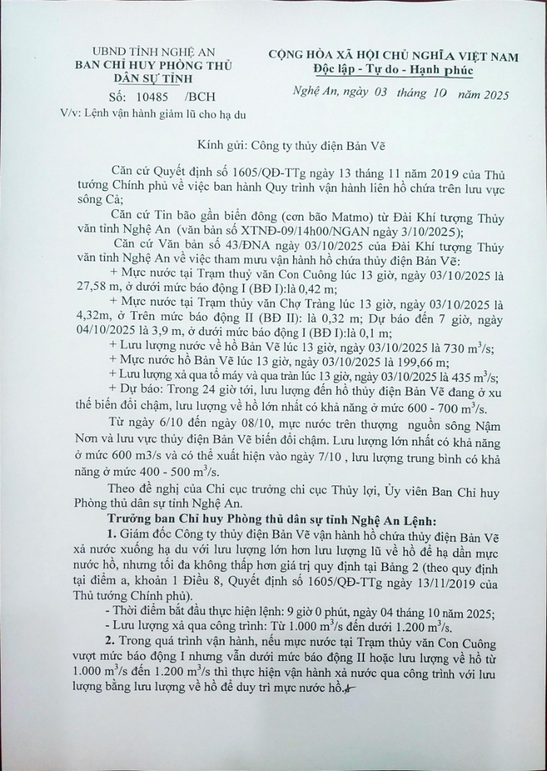 Ngày 3/10/2025, Ban Chỉ huy Phòng thủ dân sự tỉnh Nghệ An đã ban hành Văn bản số 10485/BCH về việc Lệnh vận hành giảm lũ cho hạ du. Để phù hợp với diễn biến của mưa lũ, tình hình ngập úng phía hạ du lưu vực sông Cả trên địa bàn tỉnh, Ban Chỉ huy Phòng thủ dân sự tỉnh thay đổi thời gian thực hiện lệnh tại Văn bản số 10485/BCH ngày 3/10/2025, cụ thể như sau: