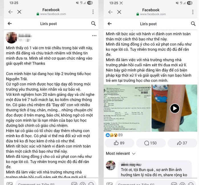 Trước đó, một phụ huynh đăng lên mạng xã hội nội dung con trai đang học lớp 2, Trường Tiểu học Nguyễn Trãi bị cô giáo chủ nhiệm "dạy dỗ" nhiều thương tích ở tay, chân, mông... Kèm theo bài đăng là hình ảnh một bé trai bị hằn đỏ tay, giấy kết quả khám bệnh.