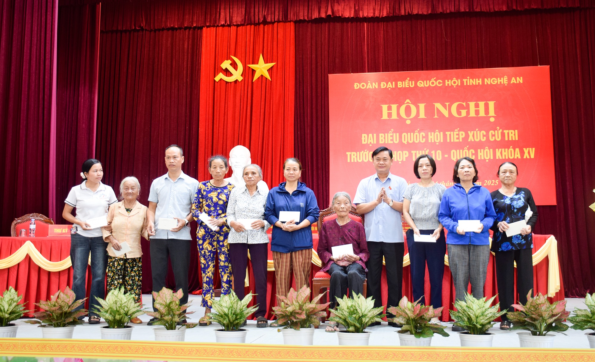 Trước khi bước vào hội nghị, đồng chí Thái Thanh Quý - Phó Trưởng Ban Thường trực Ban Chính sách, chiến lược Trung ương đã tặng 10 phần quà cho các hộ gia đình khó khăn trên địa bàn phường Vinh Phú |
