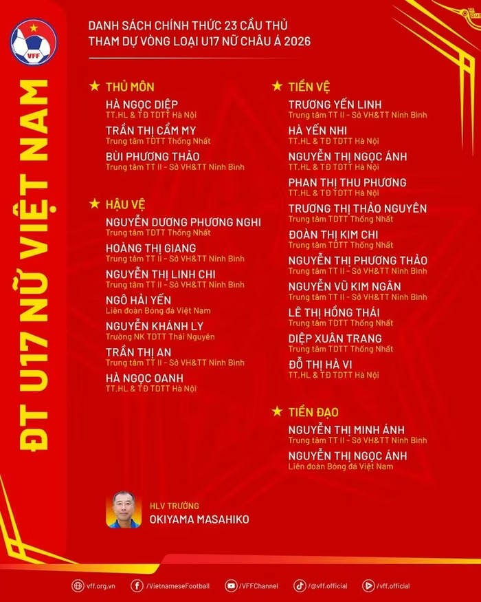 Danh sách 23 cầu thủ U17 nữ Việt Nam tham dự Vòng loại U17 nữ châu Á 2026. (Nguồn: VFF) |