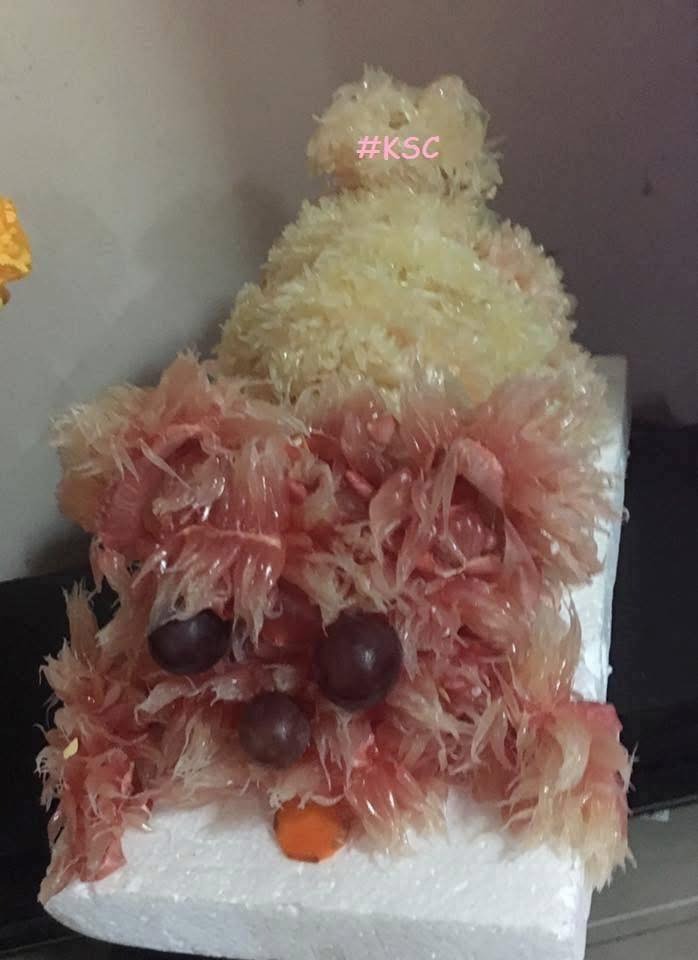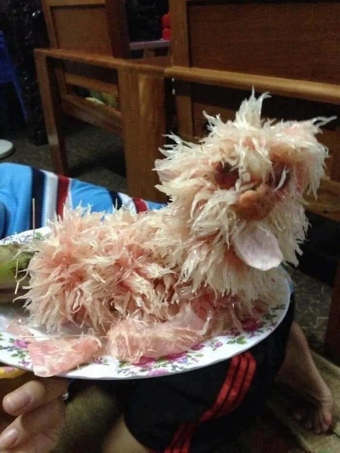 Tác phẩm chó bưởi năm nay gây bão mạng: phần "lông" bưởi bị bết lại, mắt gắn bằng nho đen trông như vừa trải qua một đêm thức trắng. Một cư dân mạng đùa: "Chó bưởi này chắc mới tắm mưa xong."