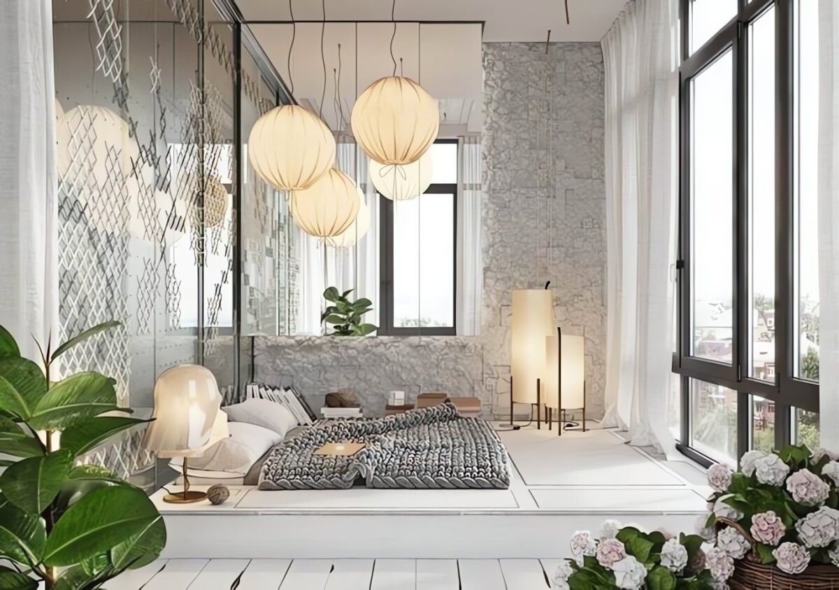 - Ánh sáng dịu nhẹ: Tránh đèn huỳnh quang ánh sáng trắng gắt. Ưu tiên ánh sáng vàng, ấm áp và có thể điều chỉnh độ sáng. Ánh sáng mờ, hoặc ánh nến (nếu an toàn) tạo ra không khí lãng mạn, giúp cơ thể và tâm trí thư giãn, tăng sự hứng khởi.