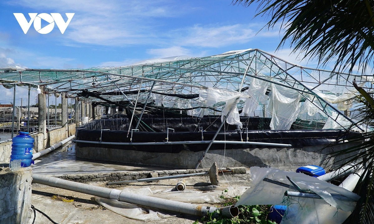 Anh Hòa cho biết thêm, sau bão, tôi đã thuê máy múc để gia cố tạm thời bờ bao bị vỡ để tránh nước biển tràn vào đồng thời huy động anh em để tháo dỡ bạt, khung cột bị đổ.Việc khắc phục sẽ còn kéo dài chưa biết mấy tháng vì ao đầm đang ngổn ngang.
