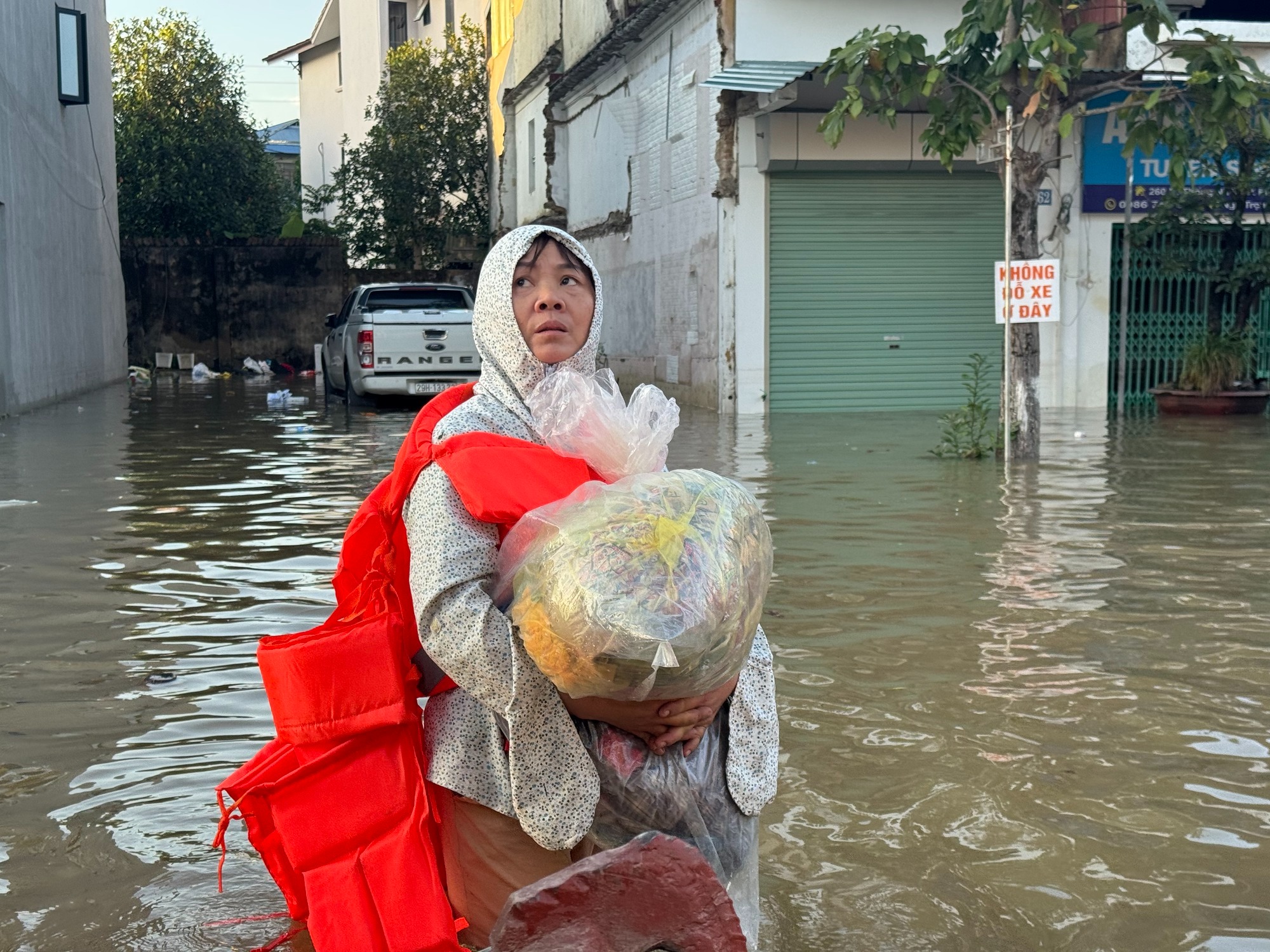 "Bà nội, bố mẹ, chú ruột và em gái tôi phải dồn lên tầng 2 tránh lụt. Đồ đạc gần như không sơ tán được gì. Vợ chồng tôi sống ở nhà riêng cách đó 15km cũng phải sơ tán, đến ở nhờ nhà người thân", anh Kiên thuật lại với Vietnamnet.