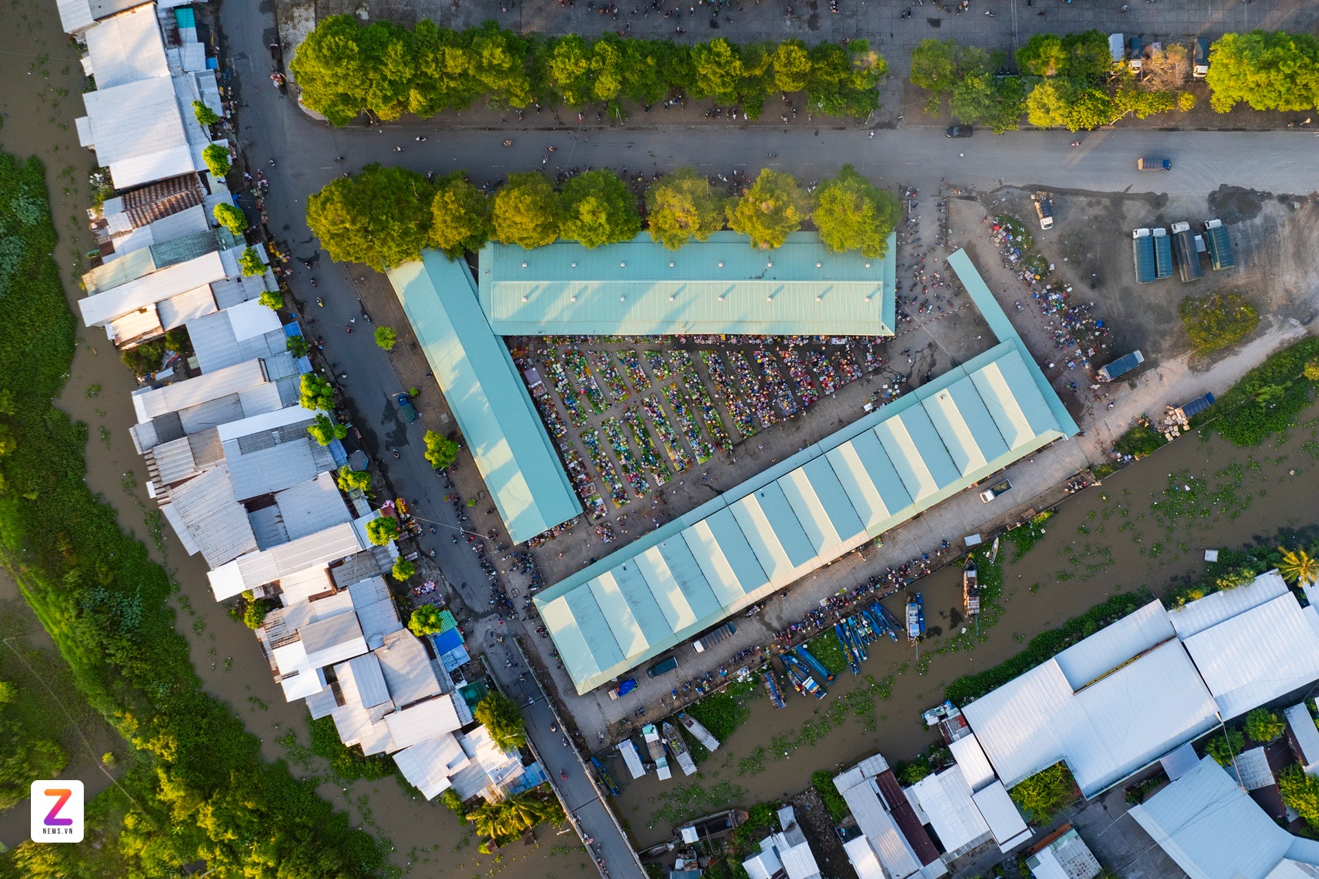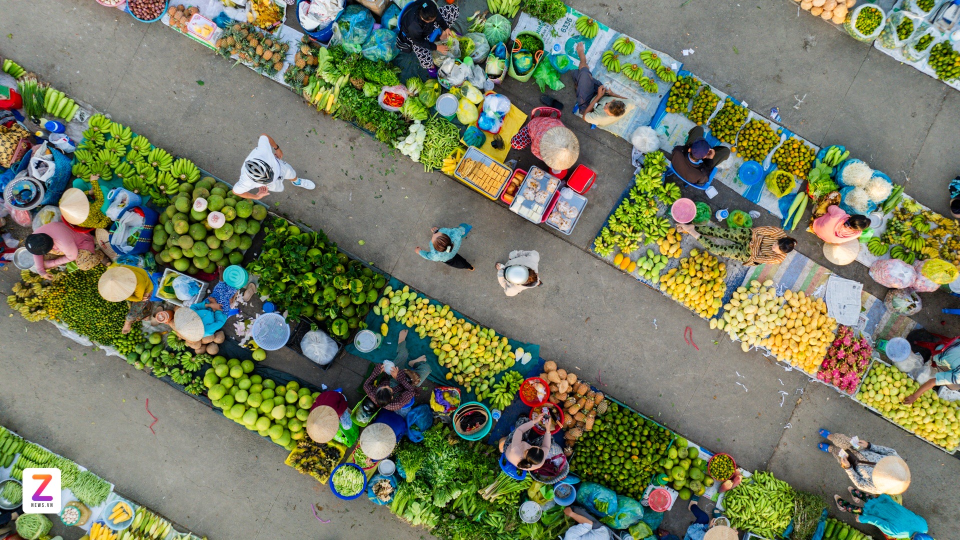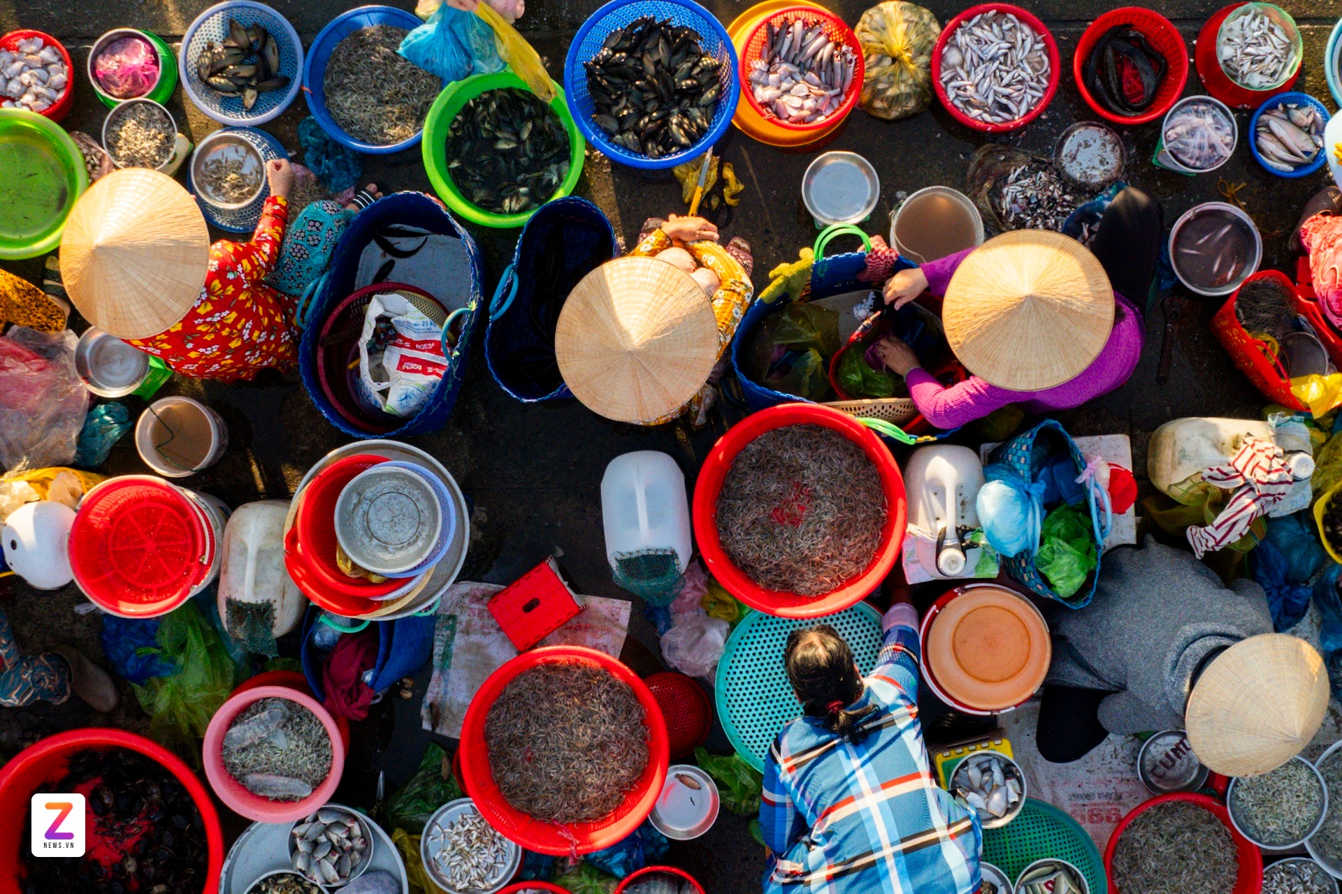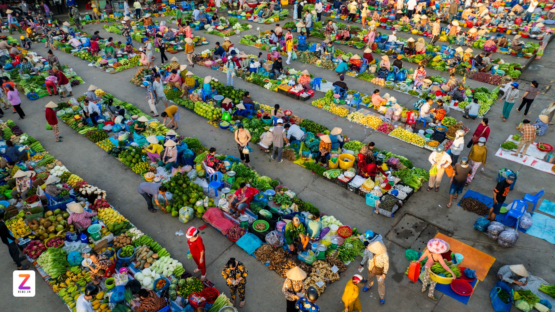 Nhìn từ trên cao, khu chợ hiện lên với những gian hàng vuông vức, gọn gàng và sạch sẽ. Người bán được bố trí chỗ ngồi theo từng khu vực riêng tùy vào loại thực phẩm, từ trái cây, rau củ, đến các loại thủy hải sản - tạo nên khung cảnh ngăn nắp hiếm thấy ở một khu chợ quê. |