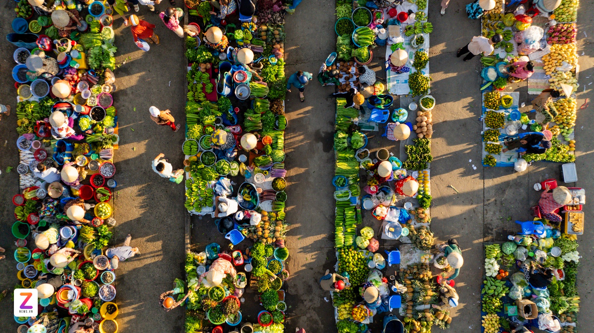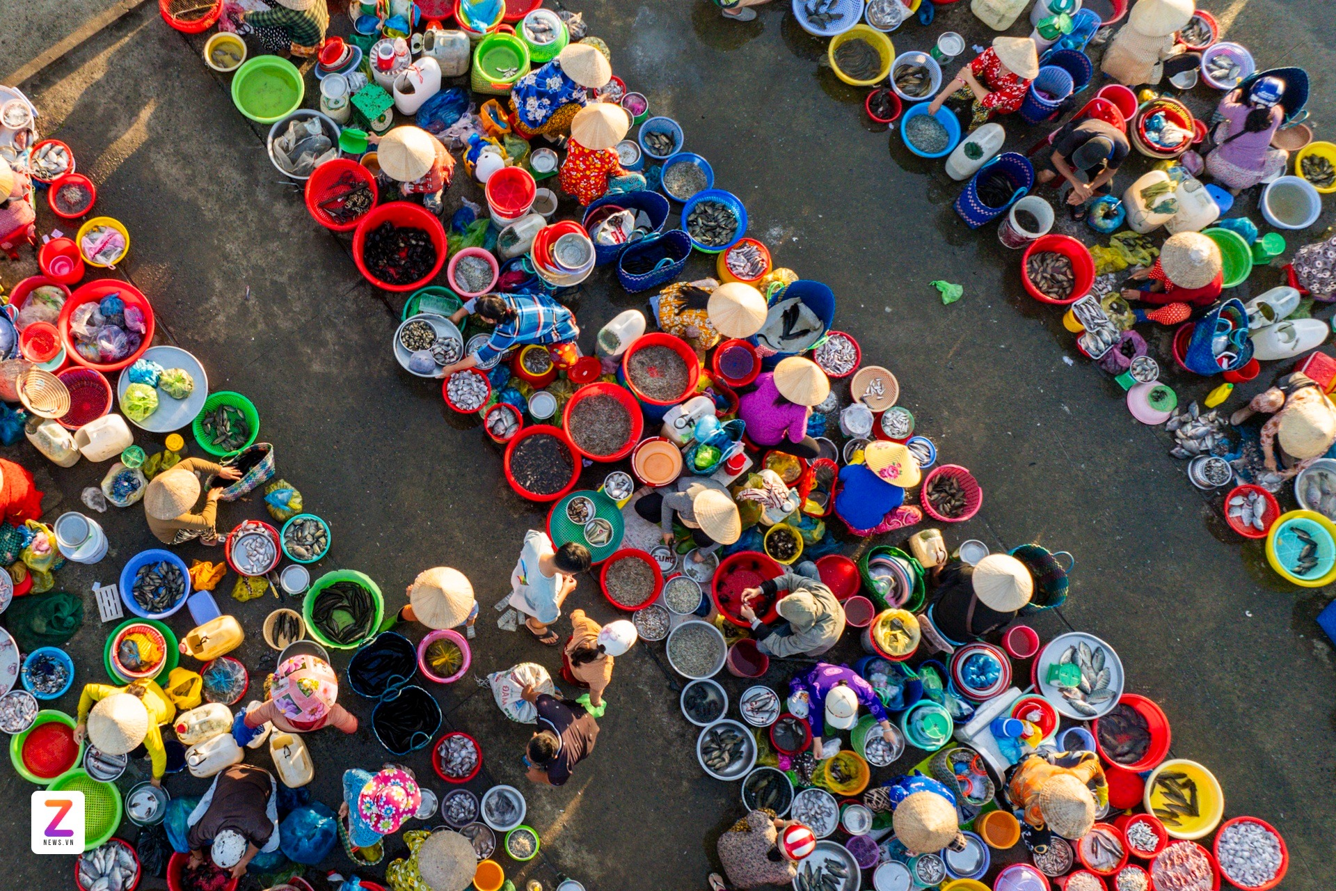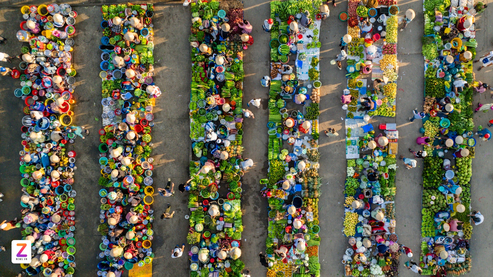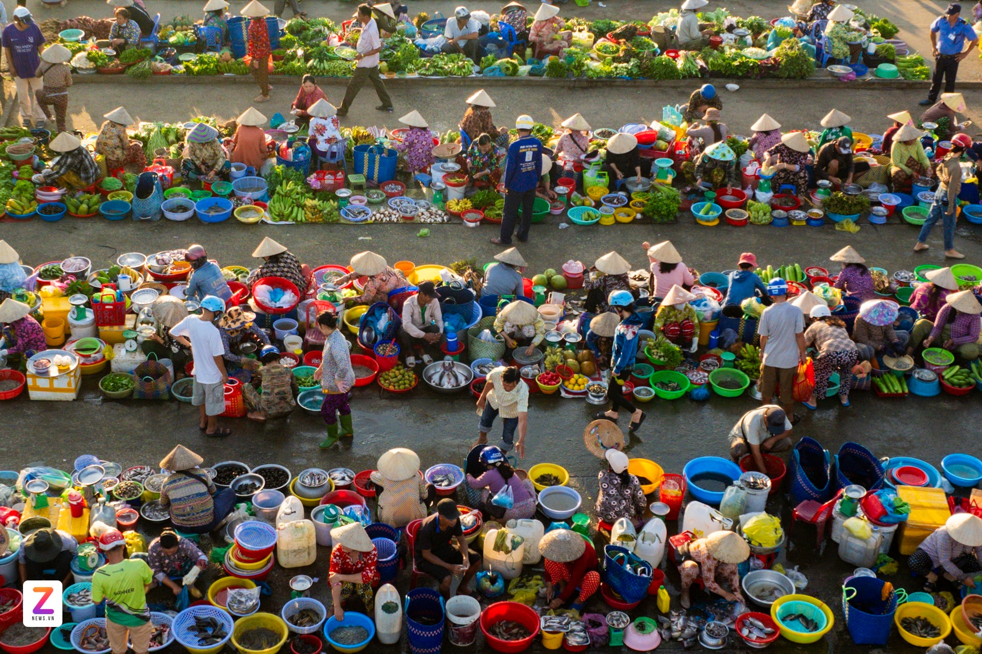 Nhìn từ trên cao, khu chợ hiện lên với những gian hàng vuông vức, gọn gàng và sạch sẽ. Người bán được bố trí chỗ ngồi theo từng khu vực riêng tùy vào loại thực phẩm, từ trái cây, rau củ, đến các loại thủy hải sản - tạo nên khung cảnh ngăn nắp hiếm thấy ở một khu chợ quê. |
