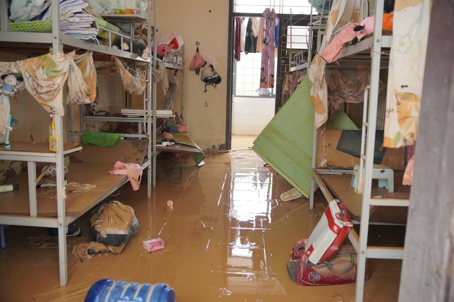 Trước đó, khi nước ngập lên, nhà trường đã thông báo với các sinh viên ở tầng 1 di chuyển lên tầng 2,3,4,5 ở ghép tạm cùng các bạn. Sau khi nước rút, toàn bộ ký túc xá tầng 1 có khoảng 12 phòng thì qua thống kê có khoảng 3 phòng mà sinh viên không ở lại dọn. Tổng tòa nhà có 14 phòng mà sinh viên không ở lại dọn.
