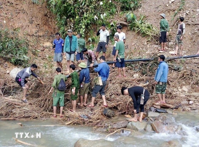Người dân khuân vác đá để xếp mặt đường hiện đang bị phủ lớp bùn nhão, sình lầy tại các điểm sạt lở. (Ảnh: TTXVN phát) |
