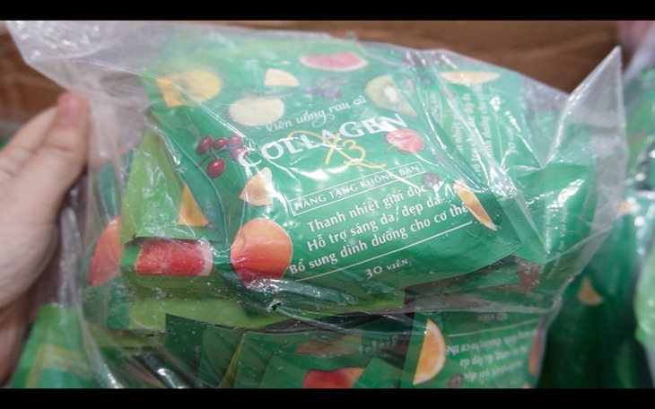 Ngân đã lợi dụng hình thức "hàng tặng kèm" để tiêu thụ thêm một loại sản phẩm khác mang tên "viên rau củ Collagen" nhưng không được cấp phép - Ảnh: Công an cung cấp |
