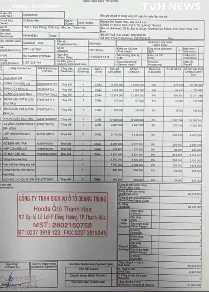 Anh V.M.H. đồng ý với số tiền báo giá dịch vụ sửa chữa theo kiểm tra thực tế (có hỗ trợ giảm giá từ phía HTHA ) là 4x triệu (khoảng hơn 40 triệu đồng). Tất cả những lần báo giá chúng tôi đều in từ phần mềm hệ thống của Honda, có dấu đỏ và đã cung cấp cho cơ quan công an.